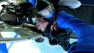 The plane circled for a minute, then the roller door was back up and my face was outside the plane. I swung my legs out and the only things preventing me from falling to my death were a couple of clips on my harness. I was looking straight up (as we were asked to do) and could see my instructor’s hand holding the railing. I dangled there – surprisingly calm – for about 20 seconds, entering a trancelike state as I tried to clear my mind. Then, in a move that instantly jolted me out of my daze, my instructor’s hand came off the railing and showed a thumbs up to the pilot. Before I had a chance to process, I felt a small shove from behind and was sent hurtling sideways out of the plane.