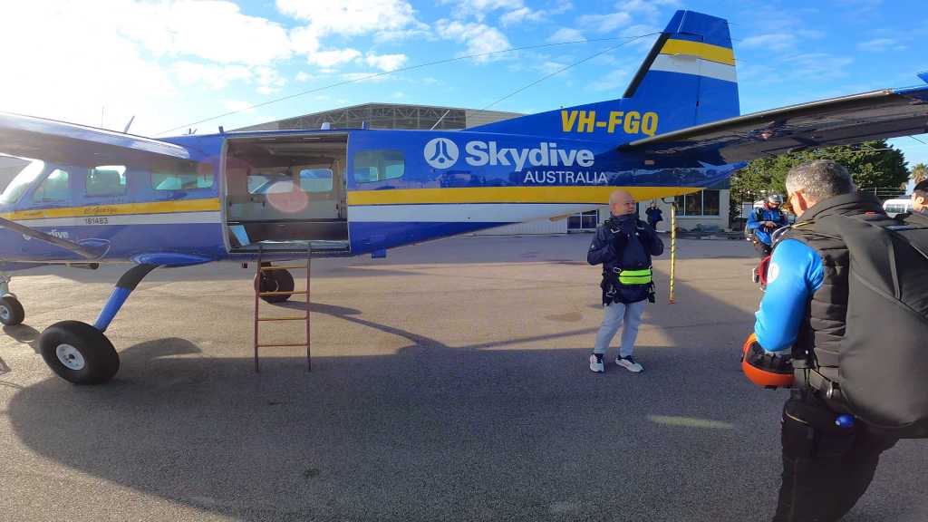 We arrived at the pickup point and were transferred by bus to Moorabbin Airport. We met our tandem instructors, got suited up, and watched a safety video before heading out to the plane. It was a tiny little thing, not nearly tall enough to stand up straight in. As we climbed in, my instructor asked me if it was my first time skydiving. I said yes, then as a joke, asked him if it was his too. Playing along, he let out a loud sigh and nodded his head. I patted him on the shoulder and assured him he’d do fine. I’m not sure if it was a symptom of my confidence or something I did to reinforce it, but either way, I felt reassured afterwards.